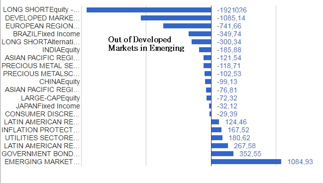 | Focus | Objective | Asset Class | Flow USD mn | | Commodities | INDUSTRIAL METALS | Commodity | 15.54 | | Commodities | PRECIOUS METAL SECTOR | Equity | -118.71 | | Commodities | PRECIOUS METALS | Commodity | -102.53 | | Commodities | PRECIOUS METALS | Mixed Allocation | 1.34 | | country | AUSTRALIA | Equity | 19.10 | | country | AUSTRALIA | Fixed Income | 4.03 | | country | AUSTRALIA | Mixed Allocation | -0.14 | | country | BRAZIL | Equity | -9.23 | | country | BRAZIL | Fixed Income | -349.74 | | country | CHINA | Equity | -99.13 | | country | CHINA | Fixed Income | -19.41 | | country | INDIA | Equity | -185.88 | | country | INDIA | Fixed Income | -4.12 | | country | ISRAEL | Equity | 0.01 | | country | JAPAN | Equity | -45759.37 | | country | JAPAN | Fixed Income | -32.12 | | country | KOREA | Equity | -9.97 | | country | POLAND | Equity | 0.62 | | country | RUSSIA | Equity | 34.81 | | country | RUSSIA | Fixed Income | -2.29 | | country | SOUTH AFRICA | Equity | 3.15 | | country | SPAIN | Equity | 0.98 | | Country | TAIWAN | Equity | 10.59 | | country | UNITED KINGDOM | Equity | 15.44 | | industry | BASIC MATERIALS SECTOR | Equity | 5.53 | | industry | COMMUNICATIONS SECTOR | Equity | 21.03 | | industry | ENERGY SECTOR | Equity | 57.19 | | industry | FINANCIAL SECTOR | Equity | -0.54 | | industry | HEALTH CARE SECTOR | Equity | 51.11 | | industry | INDUSTRIAL SECTOR | Equity | -0.57 | | industry | MULTIPLE SECTOR | Equity | 0.95 | | industry | NATURAL RESOURCES SECTOR | Equity | -21.89 | | industry | REAL ESTATE SECTOR | Alternative | -1.69 | | industry | REAL ESTATE SECTOR | Equity | 73.31 | | industry | TECHNOLOGY SECTOR | Equity | -0.19 | | industry | UTILITIES SECTOR | Equity | 180.62 | | region | AFRICAN REGION | Equity | 29.89 | | region | ASIAN PACIFIC REGION | Equity | 39.72 | | region | ASIAN PACIFIC REGION | Fixed Income | -121.54 | | region | ASIAN PACIFIC REGION EX JAPAN | Equity | 85.72 | | region | ASIAN PACIFIC REGION EX JAPAN | Fixed Income | -76.81 | | region | ASIAN PACIFIC REGION EX JAPAN | Mixed Allocation | -0.21 | | region | EASTERN EUROPEAN REGION | Equity | -1.71 | | region | EASTERN EUROPEAN REGION | Fixed Income | 5.41 | | region | EUROPEAN REGION | Equity | -741.66 | | region | EUROPEAN REGION | Fixed Income | 1.80 | | region | EUROPEAN REGION | Mixed Allocation | 0.10 | | region | LATIN AMERICAN REGION | Equity | 124.46 | | region | LATIN AMERICAN REGION | Fixed Income | 267.58 | | region | MIDDLE EAST REGION | Equity | -1.89 | | region | MIDDLE EAST REGION | Fixed Income | 1.75 | | region | NORDIC REGION | Equity | -1.23 | | region | NORTH AMERICAN REGION | Equity | -17.54 | | region | NORTH AMERICAN REGION | Fixed Income | 0.47 | | Risk | GOVERNMENT BOND | Fixed Income | 352.55 | | Risk | GOVERNMENT BOND | Mixed Allocation | 0.07 | | Risk | INFLATION PROTECTED | Brazil | -0.33 | | Risk | INFLATION PROTECTED | Fixed Income | 167.52 | | Risk | LONG SHORT | Alternative | -300.34 | | Risk | LONG SHORT | Equity | -19210.26 | | Risk | LONG SHORT | Fixed Income | -0.23 | | Risk | LONG SHORT | Mixed Allocation | 0.21 | | Sector | AGRICULTURE | Commodity | 20.49 | | Sector | AGRICULTURE | Equity | 0.01 | | Sector | CONSUMER DISCRETIONARY | Equity | -29.39 | | Sector | CONSUMER STAPLES | Equity | 4.22 | | segment | BRIC | Equity | -2.66 | | segment | BRIC | Fixed Income | 0.25 | | segment | DEVELOPED MARKETS | Equity | -1085.14 | | segment | EMEA | Equity | -0.25 | | segment | EMEA | Fixed Income | 1.92 | | segment | EMERGING MARKETS | Equity | 1084.93 | | segment | GCC | Equity | 5.88 | | segment | GCC | Fixed Income | 0.00 | | segment | GCC | Mixed Allocation | -0.02 | | segment | MENA | Equity | 0.26 | | segment | MENA | Fixed Income | -0.45 | | Size | LARGE-CAP | Equity | -72.32 | | Size | MID-CAP | Commodity | 0.28 | | Size | MID-CAP | Equity | 67.93 | | Size | SMALL-CAP | Equity | 43.15 |
