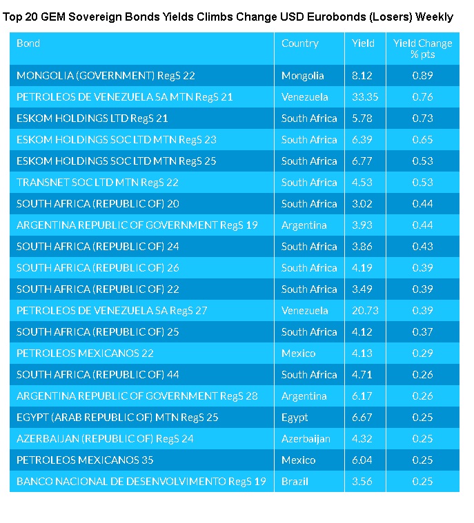 Top 20 GEM Sovereign Bonds Yields Climbs Change USD Eurobonds (Losers) Weekly