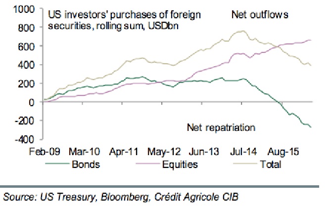 US Bond Investors have been repatriating money from international bond markets (probably other developed markets ie Japan, Europe) while increasing their bets on foreign equities. The US bond investors have probably now have plenty of cash to chase GEM yields.