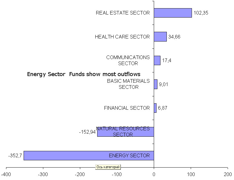COMMUNICATIONS SECTOR Equity funds showed 17.4 USD mn of inflow. ENERGY SECTOR Equity funds showed -352.7 USD mn of outflow. FINANCIAL SECTOR Equity funds showed 6.9 USD mn of inflow. REAL ESTATE SECTOR Alternative funds showed -0.3 USD mn of outflow. REAL ESTATE SECTOR Equity funds showed 102.3 USD mn of inflow. TECHNOLOGY SECTOR Equity funds showed -12.6 USD mn of outflow. UTILITIES SECTOR Equity funds showed 17.6 USD mn of inflow.