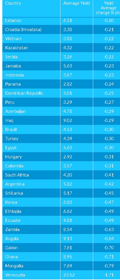 Top 20 GEM Sovereign Bonds Yields Drops Week Change USD Eurobonds (Winners)