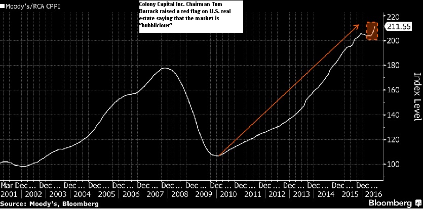 Chart: Canadian Real Estate Firms Able To Grow Dividends Source: ML, ValueWalk Chart: Colony Capital Inc. Chairman raised a red flag on U.S. real estate saying that the market is 'bubblicious' Source: Bloomberg, Moodys Chart: Most Expensive Markets, Top Increases and Top DecreasesGlobally, prime office occupancy costs increased 2.4% in the year ending Q1 2016