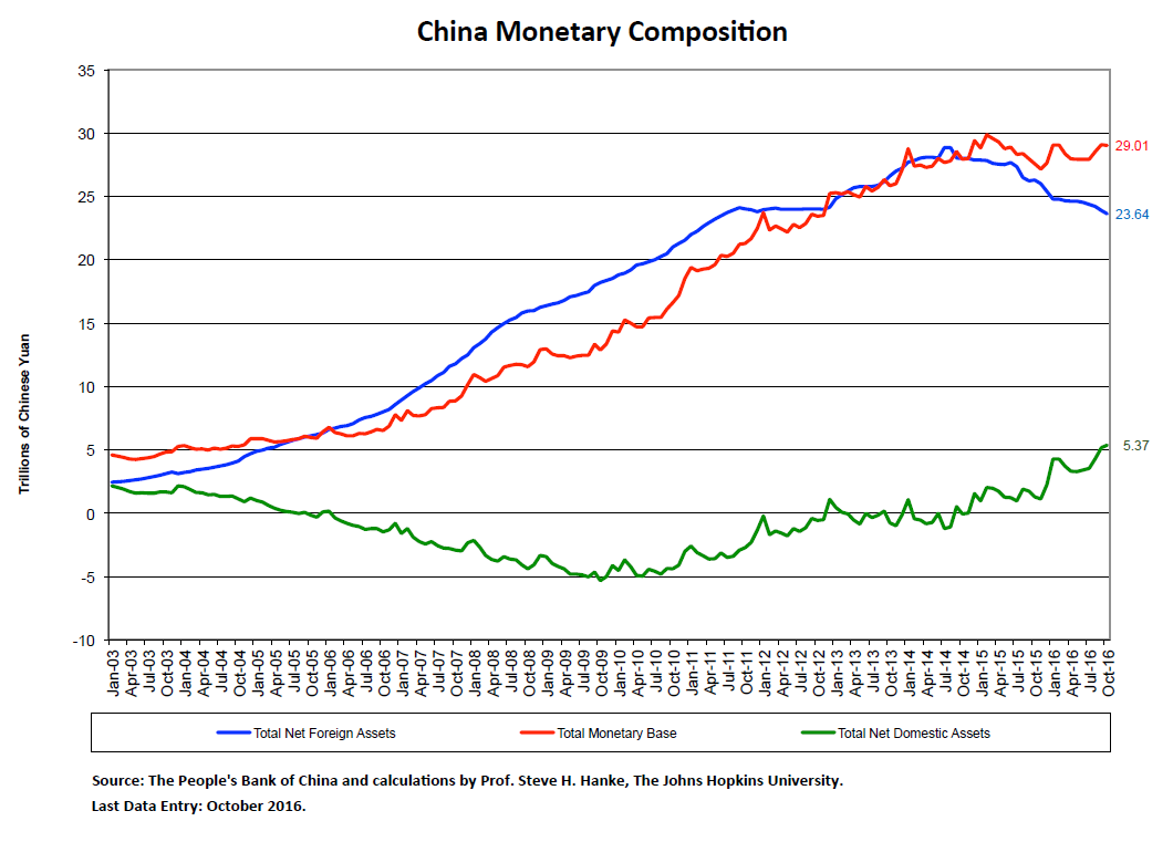 2. While the monetary liabilitiesof the PBoC have remained rather constant since late 2014, their composition has changed. The assets, which are the counterparts to the monetary liabilities, have changed dramatically. The net foreign assets have fallen and been replaced by net domestic assets. In consequence, the quality of the CNY has deteriorated. In this light, the recent tightening of China�s capital controls on outbound foreign investment is nothing more than an attempt to preserve foreign exchange and reverse the deterioration in the CNY�s quality.