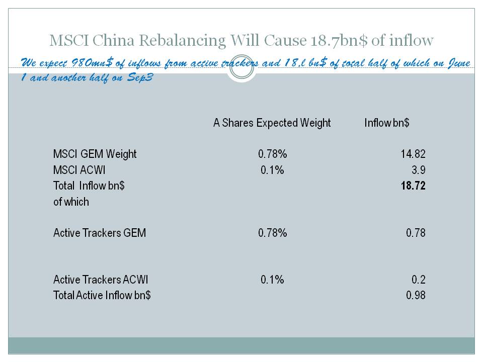 Chart: Index IdeasME, Finland, Energy – Long Turkey, Poland, Argentina - Short ![]() Source: ML Download file in Power PointKey Topics and NewsMSCI China Rebalancing Will Cause 18.7bn$ of inflow