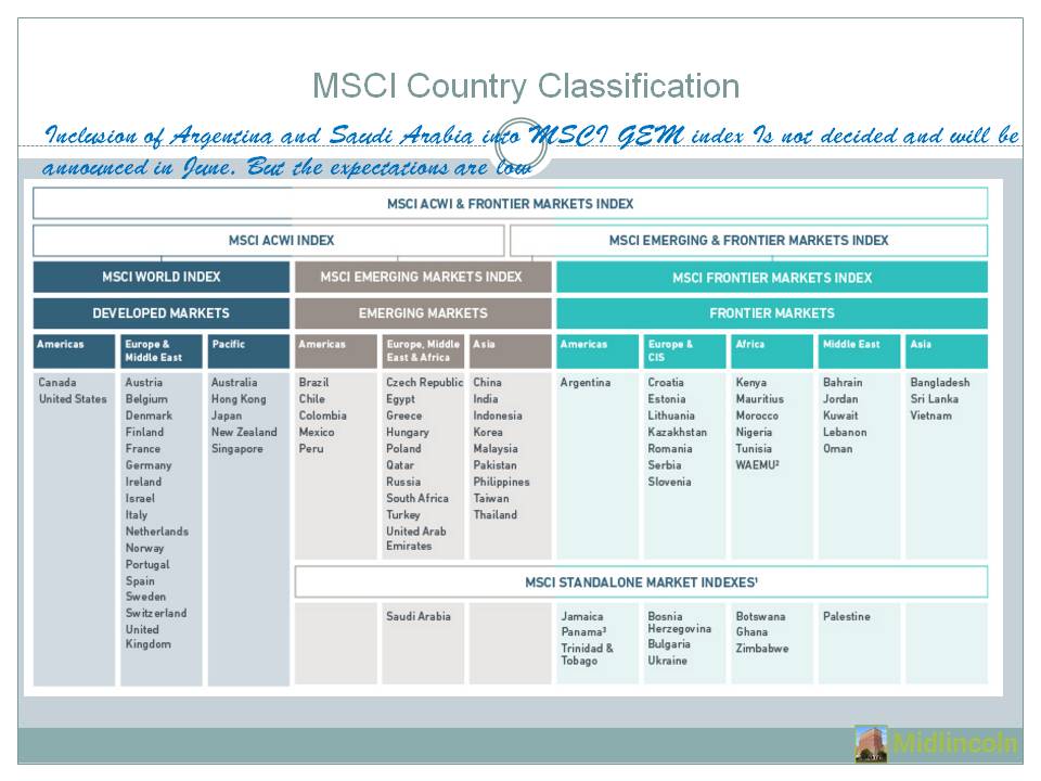 Inclusion of Argentina and Saudi Arabia into MSCI GEM index Is not decided and will be announced in June. But the expectations are low ![]() Source: ML FTSE Country Classification