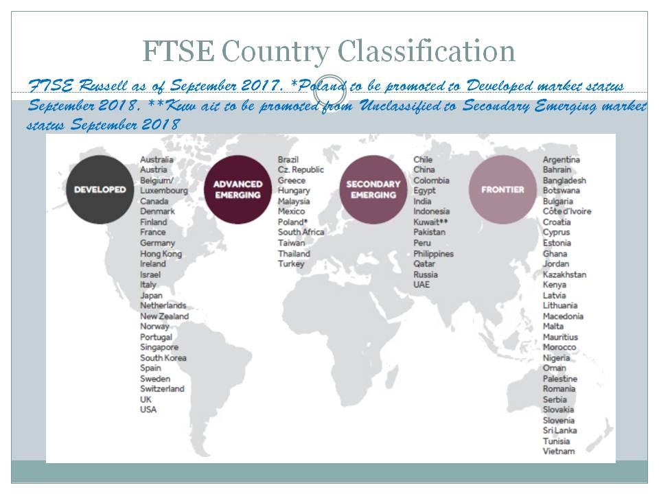 FTSE Russell as of September 2017. *Poland to be promoted to Developed market status September 2018. **Kuw ait to be promoted from Unclassified to Secondary Emerging market status September 2018 ![]() Source: ML Recent Index Atlas Ideas ChartArtIndex Rebalancing NewsMSCI Standard & Poor's Index Hang Seng FTSE Bloomberg Indices Dow Jones Moex Indexes Index Futures TradingTop 20 Index Longs Based on Momentum