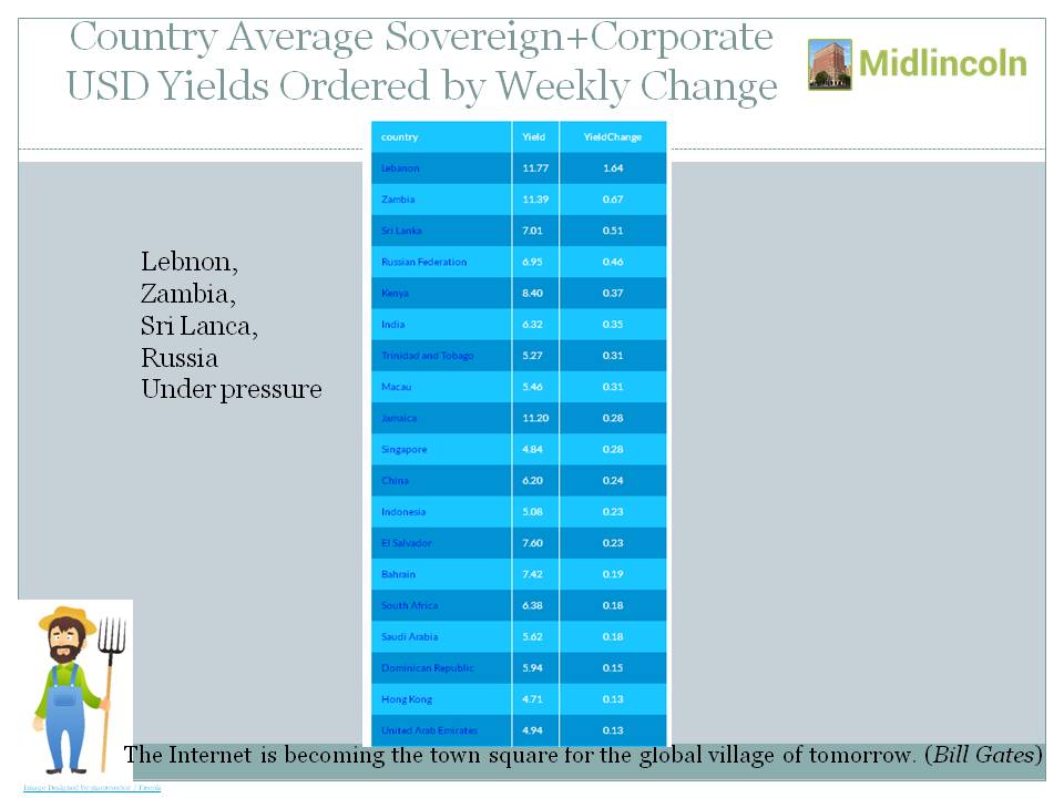 Country Average Sovereign+Corporate USD Yields Ordered by Weekly Change