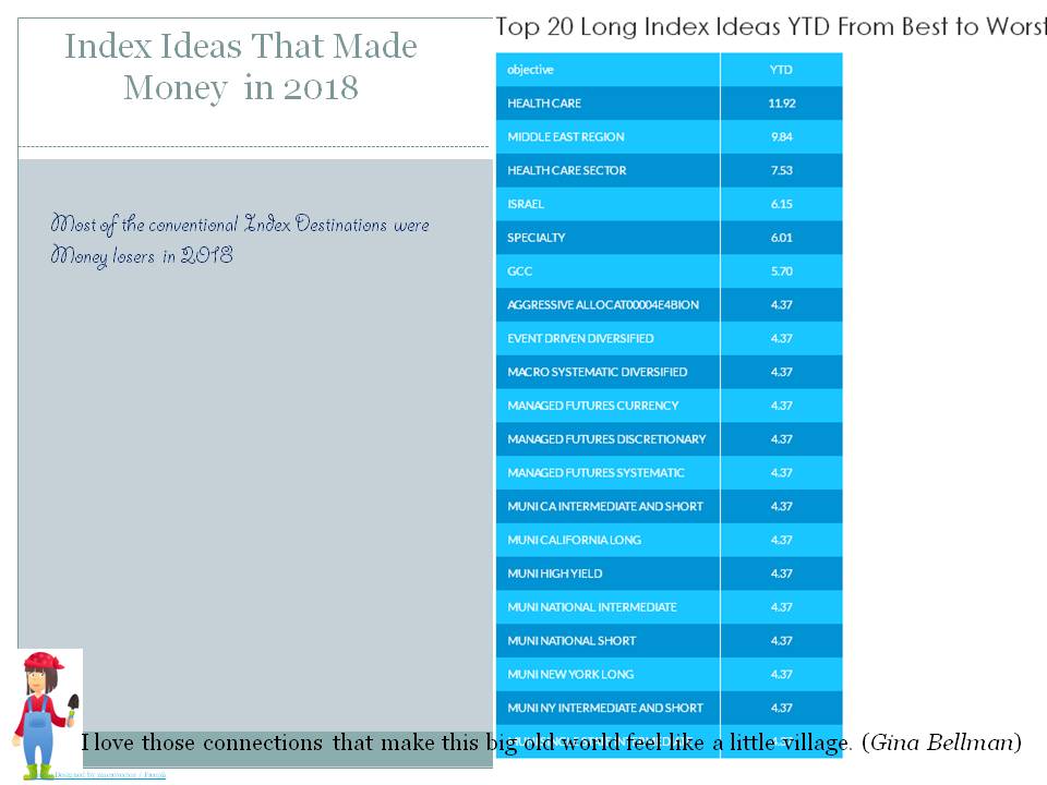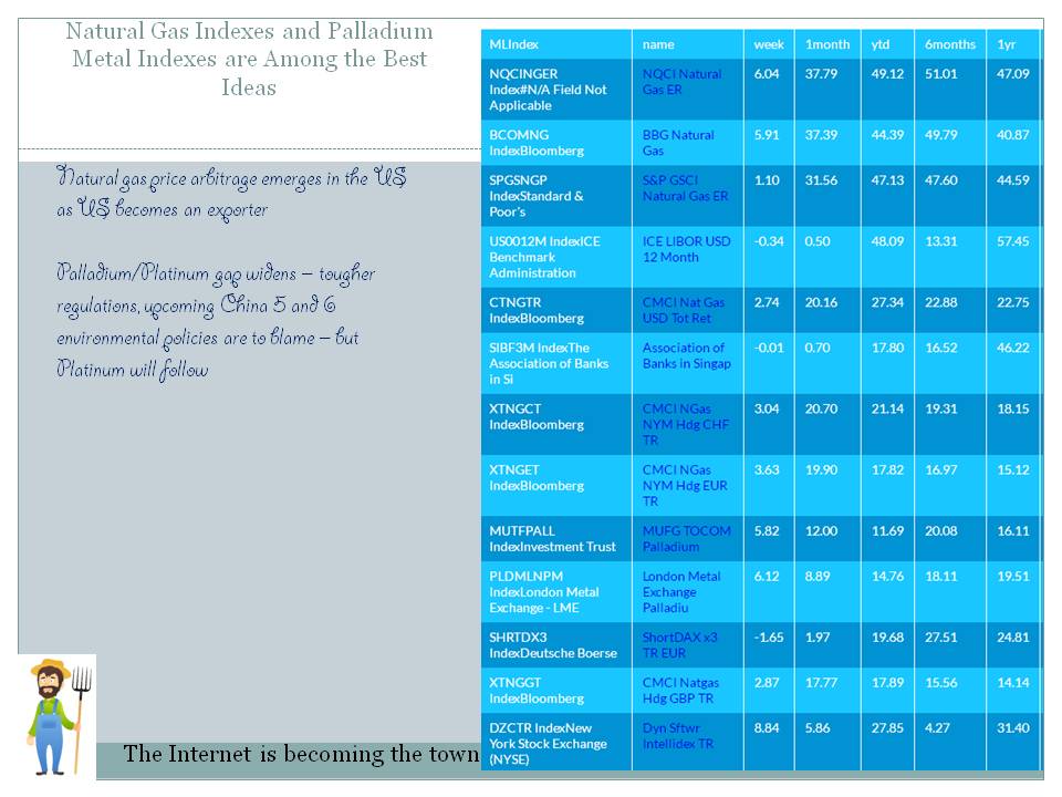 Chart: Index Ideas That Made Money in 2018Most of the conventional Index Destinations were Money losers in 2018 ![]() Source: ML Download file in Power PointKey Topics and NewsNatural Gas Indexes and Palladium Metal Indexes are Among the Best Ideas