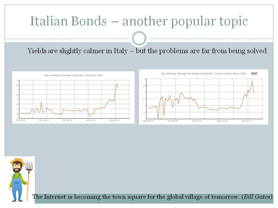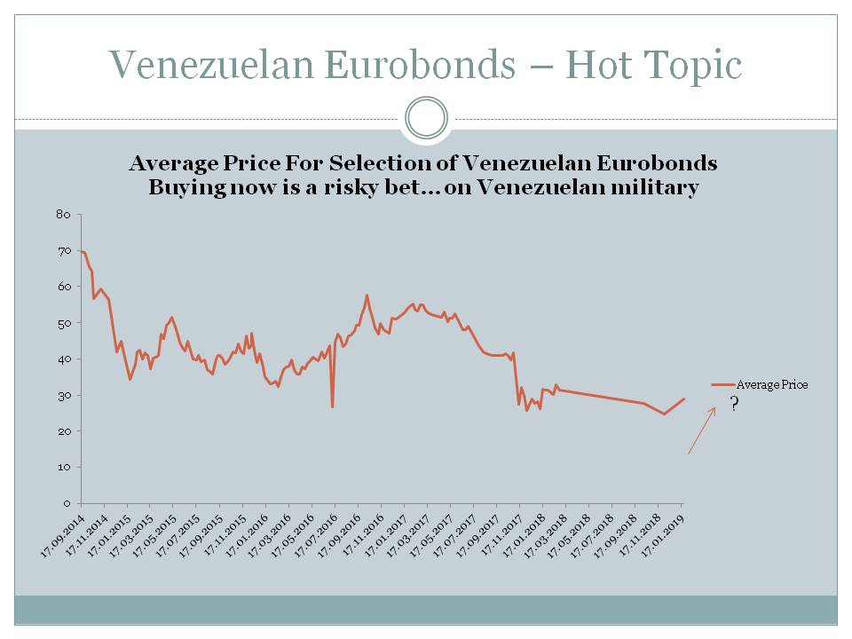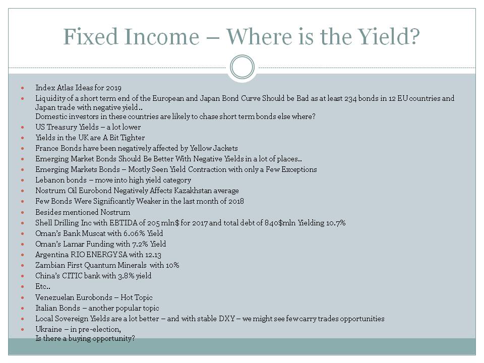 Index Atlas Ideas for 2019 Liquidity of a short term end of the European and Japan Bond Curve Should be Bad as at least 234 bonds in 12 EU countries and Japan trade with negative yield..Domestic investors in these countries are likely to chase short term bonds else where? US Treasury Yields – a lot lower Yields in the UK are A Bit Tighter France Bonds have been negatively affected by Yellow Jackets Emerging Market Bonds Should Be Better With Negative Yields in a lot of places.. Emerging Markets Bonds – Mostly Seen Yield Contraction with only a Few Exceptions Lebanon bonds – move into high yield category Nostrum Oil Eurobond Negatively Affects Kazakhstan average Few Bonds Were Significantly Weaker in the last month of 2018 Besides mentioned Nostrum Shell Drilling Inc with EBTIDA of 205 mln$ for 2017 and total debt of 840$mln Yielding 10.7% Oman’s Bank Muscat with 6.06% Yield Oman’s Lamar Funding with 7.2% Yield Argentina RIO ENERGY SA with 12.13 Zambian First Quantum Minerals with 10% China’s CITIC bank with 3.8% yield Etc.. Venezuelan Eurobonds – Hot Topic Italian Bonds – another popular topic Local Sovereign Yields are a lot better – and with stable DXY – we might see few carry trades opportunities Ukraine – in pre-election, Is there a buying opportunity?